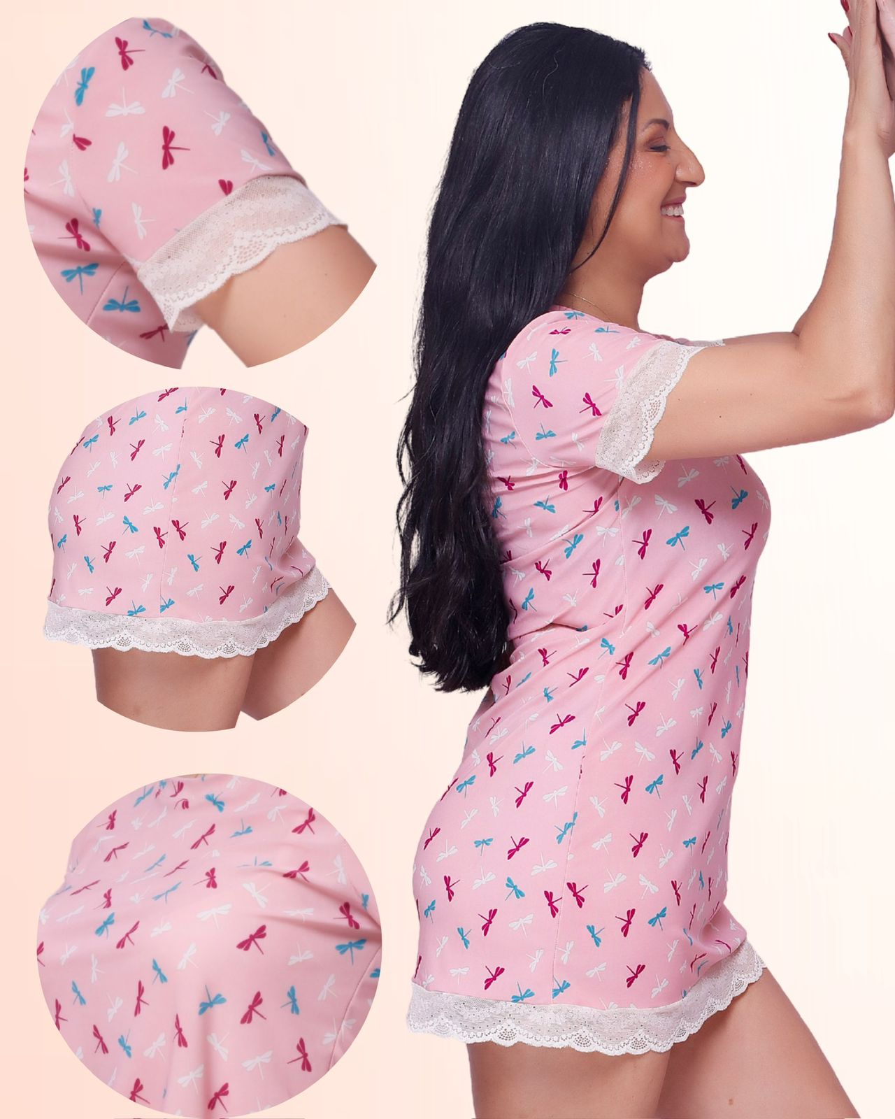 Apaixonante camisola Lívia confeccionada com tecido liganete. Com uma delicada estampa de libéluas, o tecido em tecido é macio e fresco. Traz detalhes em renda chantilly exclusiva que adornam a manga e a barra, acrescentando elegância e feminilidade á peça.