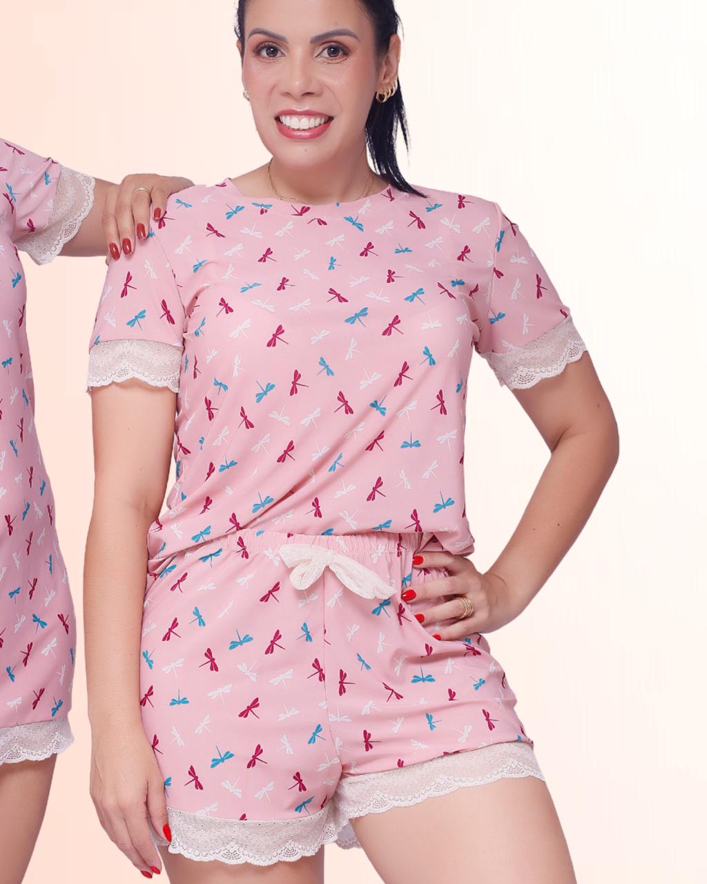 Apaixonante shortdoll Lívia confeccionado em liganete com delicada estampa de libélulas ou poá, confeccionado em tecido macio, fresco e de toque gelado, perfeito para completar uma noite quente de verão, transformando-a em uma noite agradável e suave.