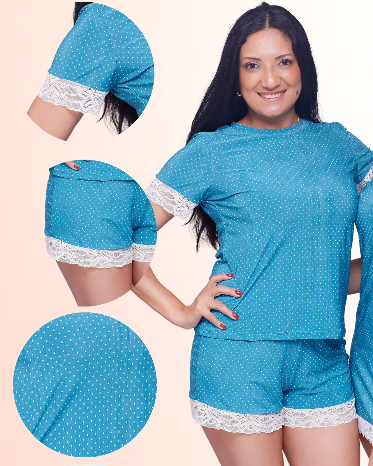 A blusa traz detalhes em renda chantilly exclusiva apenas nas mangas, acrescentando elegância e feminilidade à peça. O short possui modelagem básica e confortável, com renda chantilly na barra e um laço em renda do mesmo tecido, criando um visual harmonioso e sofisticado.